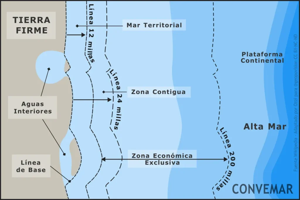 El Estado costero tiene soberanía plena sobre las aguas, el espacio aéreo, el lecho y el subsuelo hasta doce millas náuticas desde la línea base. Los buques extranjeros tienen derecho de paso inocente (continuo, sin actividades hostiles como pesca o investigación militar).